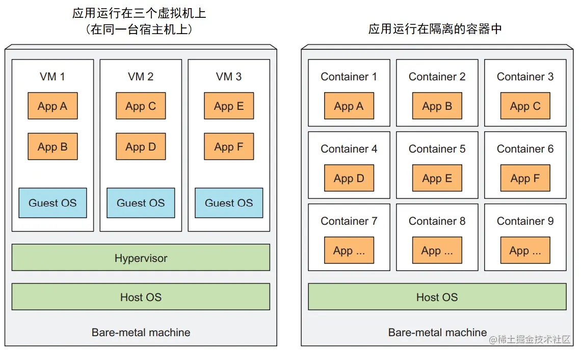 比较尴尬的情况是,由于虚拟机比较耗资源,导致没有足够的资源为每个应用程序分配一个专用的虚拟机,我们最终可能会将多个应用分组部署到每个虚拟机内。当使用容器时,我们可以而且应该为每个应用分配一个容器。因此,在同一台裸机上可以运行更多的应用程序。