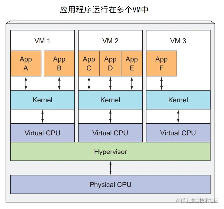 当在一台主机上运行三个虚拟机的时候,你就拥有了三个完全隔离的操作系统,它们运行并共享一台裸机。宿主机操作系统和一个虚拟层(Hypervisor) 位于这些虚拟机下面,这个虚拟层会将物理硬件资源分成一些更小块的虚拟资源,从而被每个虚拟机内的操作系统使用。应用程序在虚拟机中运行,会调用虚拟机操作系统内核程序,然后内核程序会通过Hypervisor在宿主机的物理CPU上执行x86指令。而多个容器则会对运行在宿主机操作系统上的同一个内核执行调用,该内核是唯一一个在宿主机CPU上执行x86指令的内核。通过使用容器技术,CPU不需要做任何虚拟化,而虚拟机是需要对CPU做虚拟化的。可以通过下图了解应用程序在虚拟机或容器中使用CPU方式的差异: