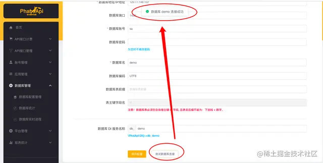 回到接口大师的数据库配置管理,填写并保存后,可以测试你的SQL Server数据库连接。如果连接失败,请核对数据库地址、账号密码和端口是否开放了安全访问。