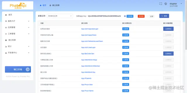 查看已申请的应用和已获得权限的接口,