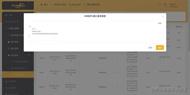 进入管理后台的【API接口管理】-【接口监控】-【接口访问日记】,可以查看API接口被调用的详细日记和接口请求参数。