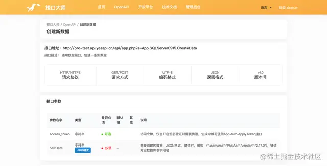 先来调用API接口创建添加一条新数据,进入【接口大师 / OpenAPI / 创建新数据】,查看一下接口的基本信息。