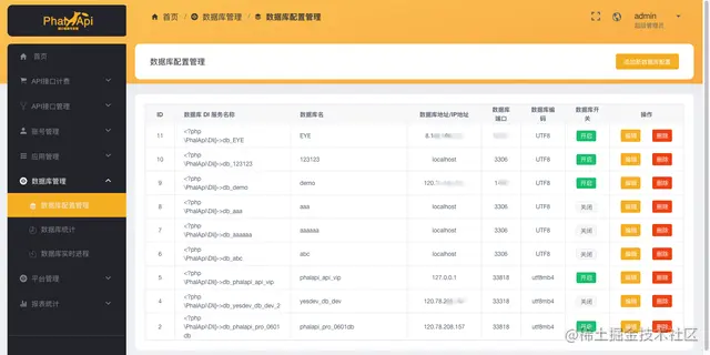 在管理后台,进入【数据库管理】-【数据库配置管理】,可以查看已经配置的数据库列表,除了支持微软的SQL Server,还支持MySQL等开源数据库。