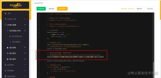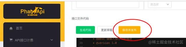 填写好接口的信息后,点击【生成代码】,系统会根据你填写的接口信息,自动生成接口PHP源代码。