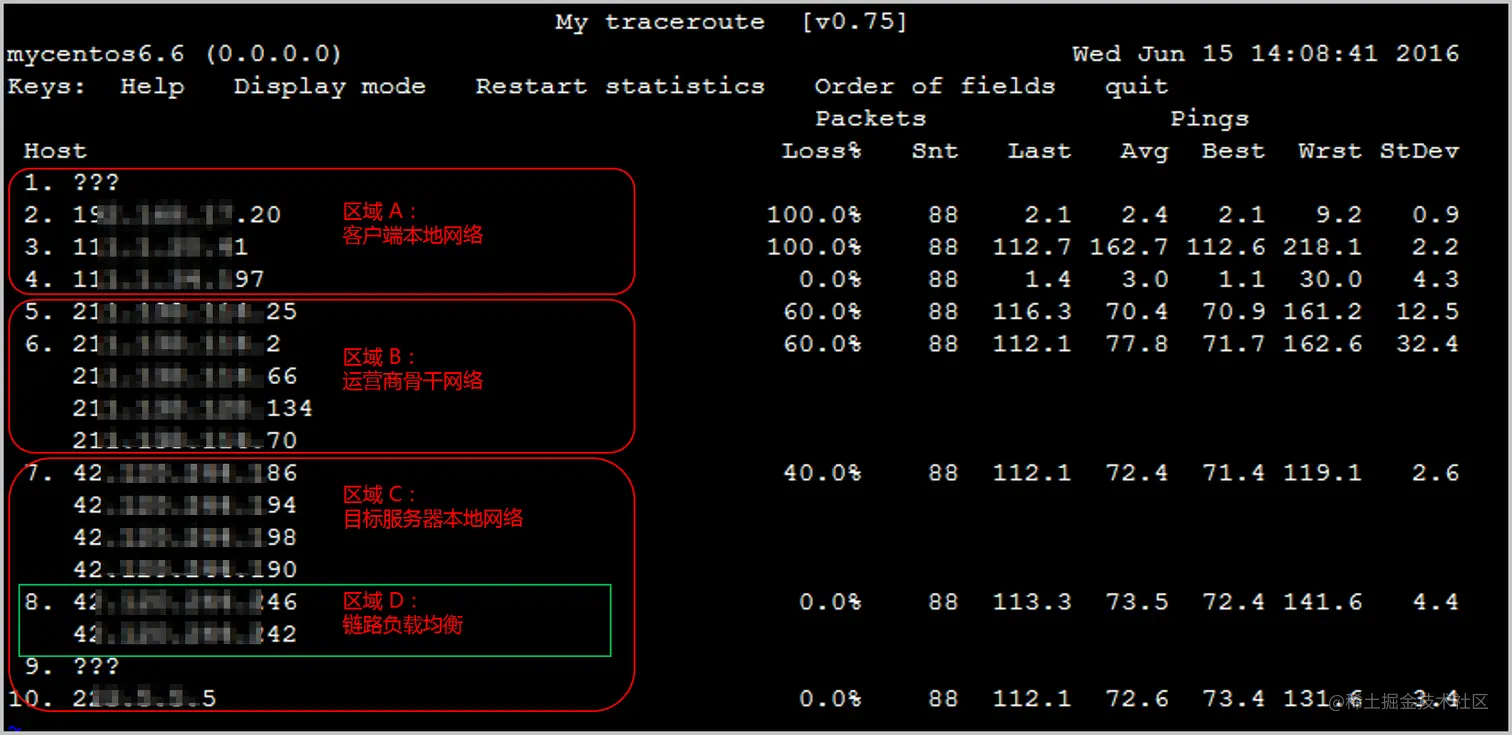mtr(My traceroute)几乎是所有Linux发行版本预装的网络测试工具。其将ping和traceroute的功能合并,所以功能更强大。mtr默认发送ICMP数据包进行链路探测。您也可以通过-u参数来指定使用UDP数据包进行探测。相对于traceroute只会做一次链路跟踪测试,mtr会对链路上的相关节点做持续探测并给出相应的统计信息。所以,mtr能避免节点波动对测试结果的影响,所以其测试结果更正确,建议优先使用。