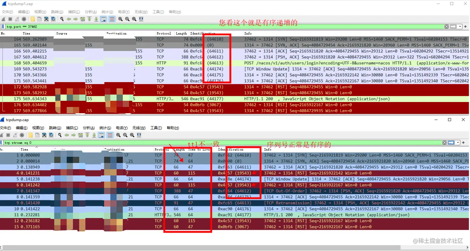 并且通过该rst报文的 ttl 和 ip序列号, 更证明了该报文不是阿里云发出的。 是中间公网运营商设备伪造发送的rst报文。