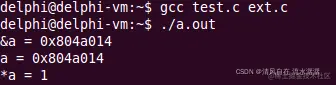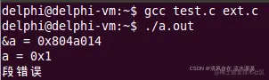 ext.c 中 a[ ] 的地址为 0x804a014,test.c 中的 extern int* a; 只是申明标识符 a,编译器会认为在这之前就已经给了地址值,就是 0x804a014,所以 printf("a = %p\n", a); 就是打印 0x804a014 地址中的 4 个字节的数,也就是 a[ ] 数组中的第一个元素 1,所以打印 0x1,*a 就是取 0x1 地址中的数,但是这个地址值是留给操作系统的,不可访问,访问就会产生段错误。