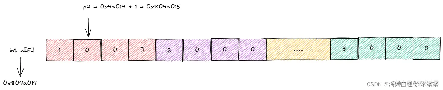 p1[-1] 就是 *(p1 - 1),由于 p1 指向的元素是 5 后面的位置,减 1 之后就指向了 5;p2 的地址是 0x804a015(注意 linux 系统为小端系统),*p2 就是 0x02000000,对应十进制的值就是 33554432;p3 的地址为 &a[1],所以 p3[1] 就是 3 了。