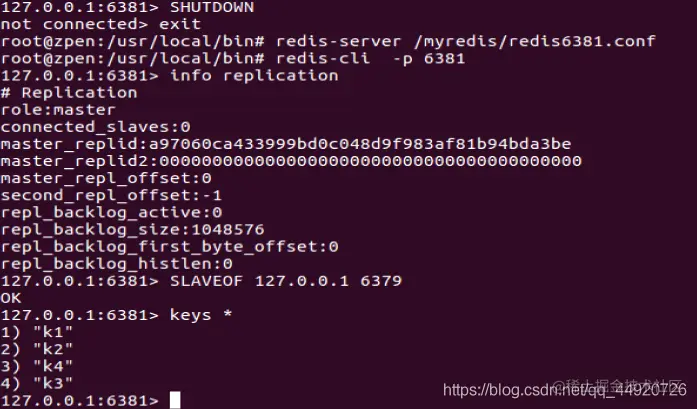 先将6381端口的服务器关掉,然后将6379的数据清空,插入k1 ,k2 k3 数据,这时候6381端口的服务器如加入“仆人”的身份,6379端口插入k4数据,6381端口查看时,6379的所有数据都存在