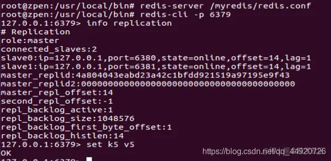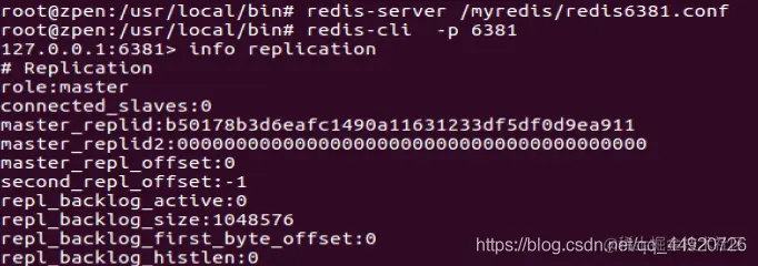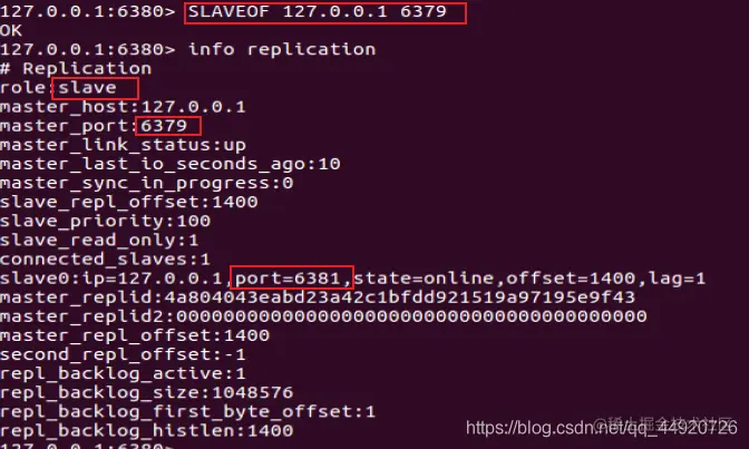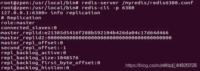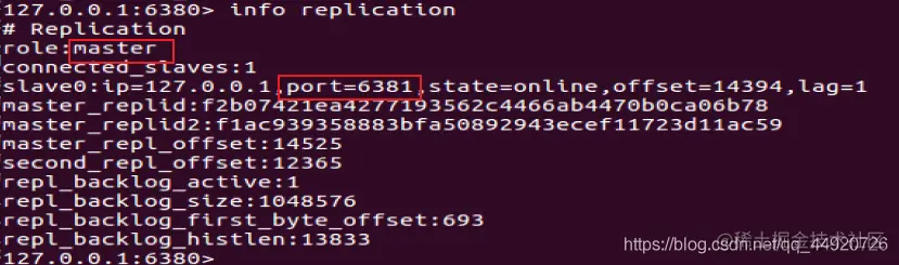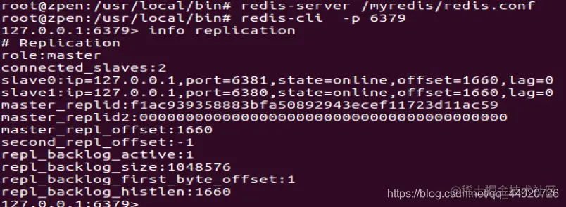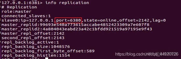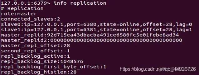 6379服务器中 使用 info replication 命令查看slave ,可以看到有6380和6381两台服务作为slave