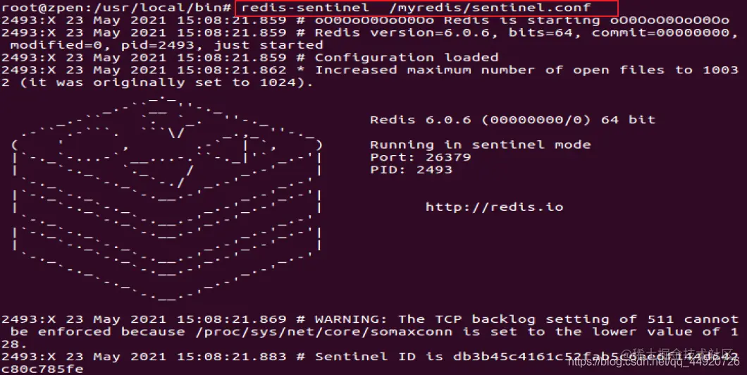 使用 redis-sentinel /myredis/sentinel.conf 命令启动哨兵。 上述目录依照各自的实际情况配置,可能目录不同