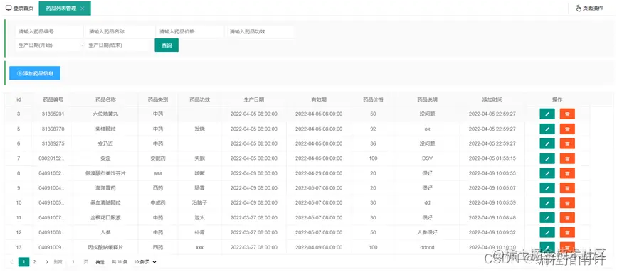 (5)对药品管理功能管理员可以做药品添加、药品修改、药品删除和多条件查询操作。药品添加可以将药品的一些常见信息的录入。药品修改可以对药品的信息进行修改其他的生产日期和有效期是不能修改的,因为这是药品出厂已经规定好的。药品删除只能根据id删除,点击按钮把id传递到后台,在数据库删除记录即可。药品查询可以多条件查询条件可以输入药品的编号、药品的名称、药品的类别、主治功能、生产日期、药品价格进行模糊查询并分页展示在页面!