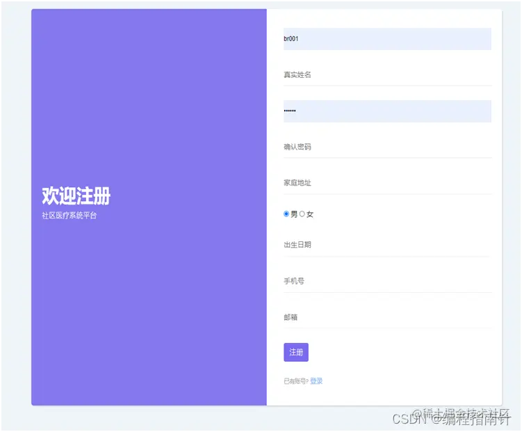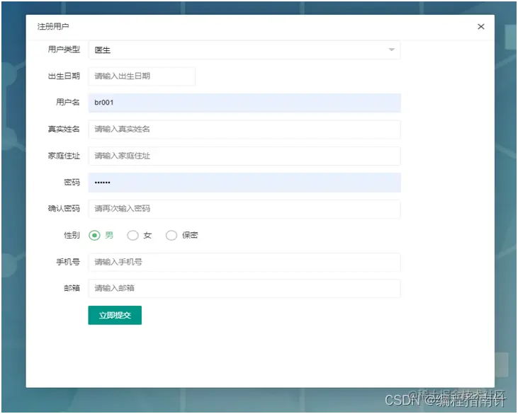 注册功能也是分为两套,患者和医生注册。当患者第一次在本院就诊时如果没有用户必须要注册才能在线预约就诊。如果医生想在本社区平台进行坐诊,也是要进行注册的注册成功后管理员进行分配科室即可。