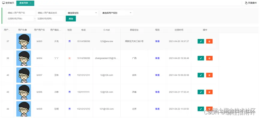 (2)对患者管理管理员没有添加功能,如果患者没有账户是需要通过患者在主页中点击注册进行注册用户之后,才可以进行预约。所以管理员只能对患者进行修改、删除和多条件分页查询。管理员可以修改患者的用户名、真实姓名、邮箱、级别(普通/VIP)、性别、手机号这些信息,在提交数据时是通过患者的唯一主键id进行修改用户信息。删除操作必须要通过主键id进行删除。条件查询可以根据管理员的任意组合方式进行全方位的查询。