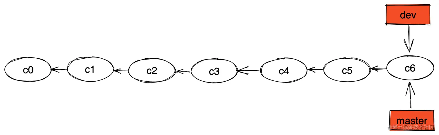 现有主分支 master,开发某种功能的分支 dev,dev 上面的内容已经开发完成了,现在要将 dev 分支上的内容合并到 master