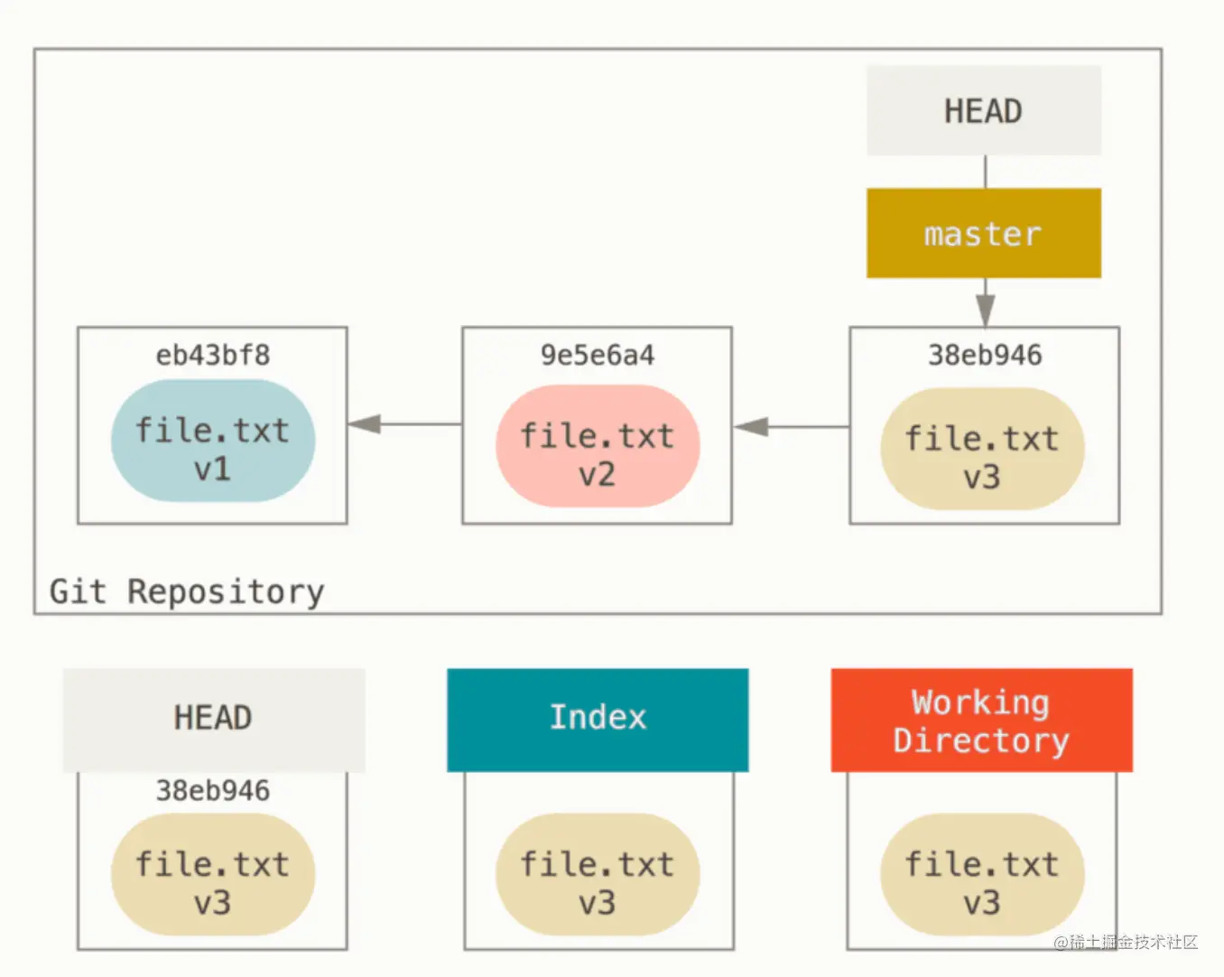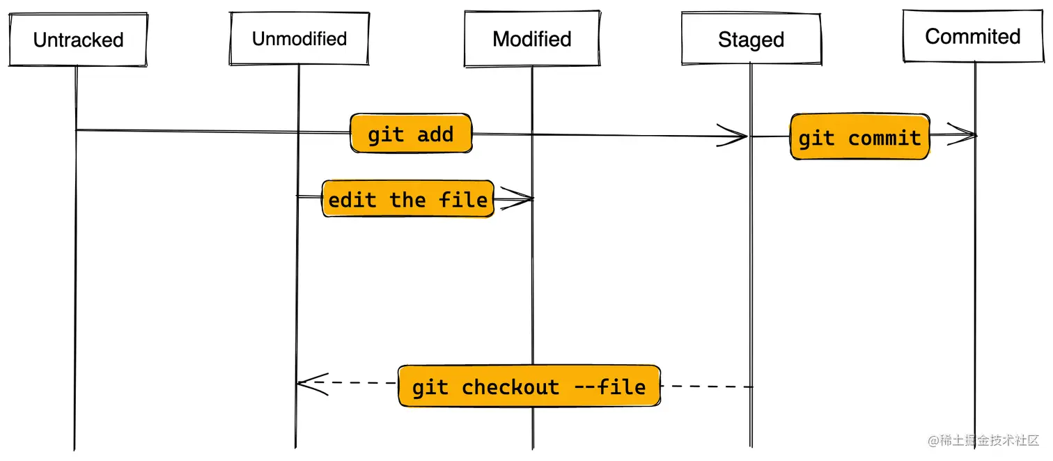 我们也可以通过指针一个具体的提交来拉取对应的文件版本,类似于 git reset eb43bf file.txt,这时候再运行 git commit,就会将该版本的 file.txt 提交。