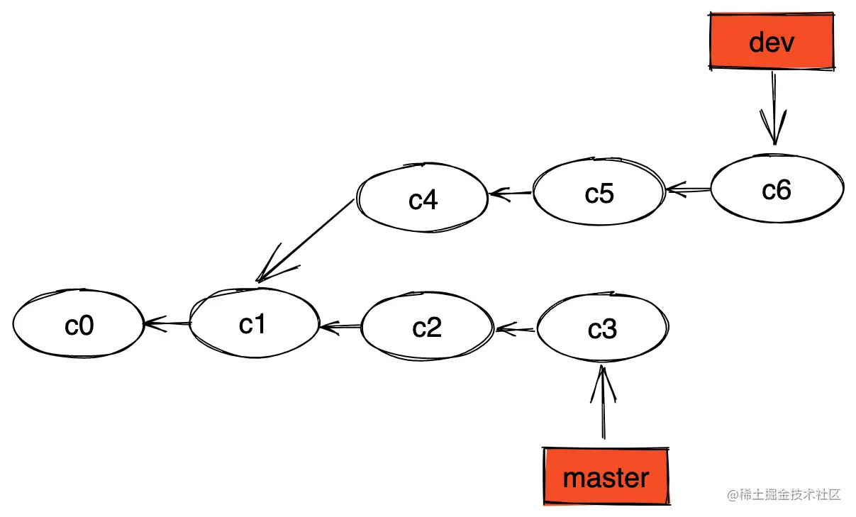 git rebase 的原理是先找到两个分支(master 与 dev)的最近公共祖先,然后对比 dev 分支对于该祖先的历次提交,提取相应的修改并存为临时文件,然后将当前分支指向目标分支(master)的最新一次的提交,最后将之前另存为临时文件的修改依序应用