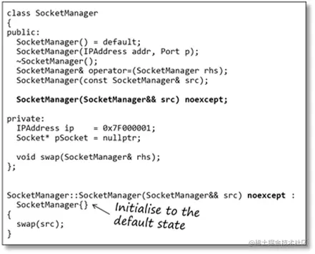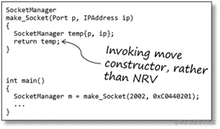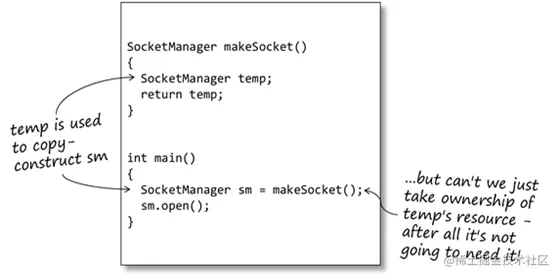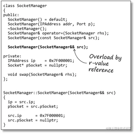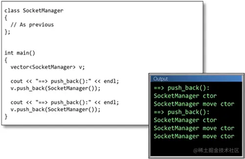 现在, 回到最初的例子, SocketManager 的 vector. 当 SocketManager 有了移动构造函数, 对象会被移动而非拷贝. (注意: 我们没有修改 vector 的代码, 它会一直试图移动类 SocketManager, 但是如果类不具备移动构造函数, 编译器将选择次佳方案 - 将右值对象绑定到一个 const SocketManager& 上; 即拷贝构造函数).
