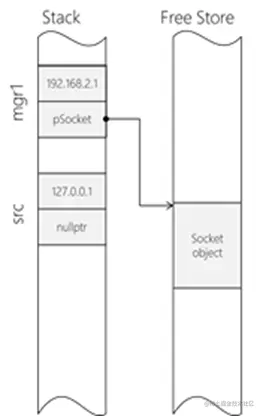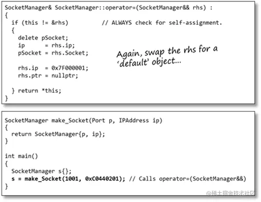 移动构造函数 "主张" 被提供右值的资源. 通过将设置右值 pSocket 为 nullptr, 当右值对象超出作用域时, 它的析构函数将不会做任何操作.