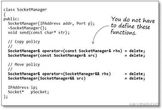 "The Rule of The Big Four (and a half)" 指的是, 如果你编写了上述其中一个函数, 你必须为其他函数定义一个策略. 这不是意味着你必须实现其他函数. 实际上, 你必须为你创建的类提供一套资源管理策略. 你的策略可以是以下其中之一: