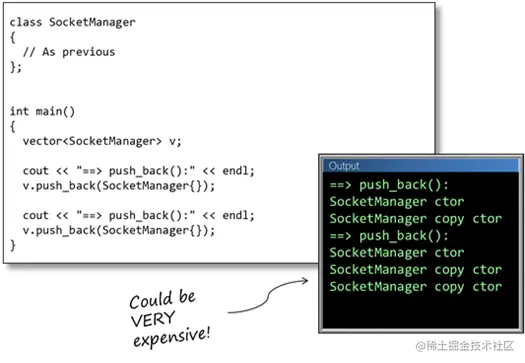 我们期望通过构造函数创建一个(临时)的 SocketManager 对象, 然后通过拷贝构造函数将其插入到 vector 中. 在第二次插入时, vector 为了存储两个新的对象, 重新分配内存, 然后将两个对象拷贝进去, 这就造成了第二次的拷贝构造(注: 第二次插入时, 产生了两次拷贝构造, 一次拷贝原容器对象, 一次拷贝新创建的临时对象). 这种操作有一定的代价, 因为每次拷贝需要释放/重新分配内存并复制数据.