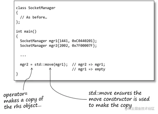之前定义的赋值操作在被调用之前, 拷贝了赋值符号右侧的对象. 这通常会调用常规的拷贝构造函数. 然而, std::move 将导致编译器为符号右侧对象调用移动构造函数.