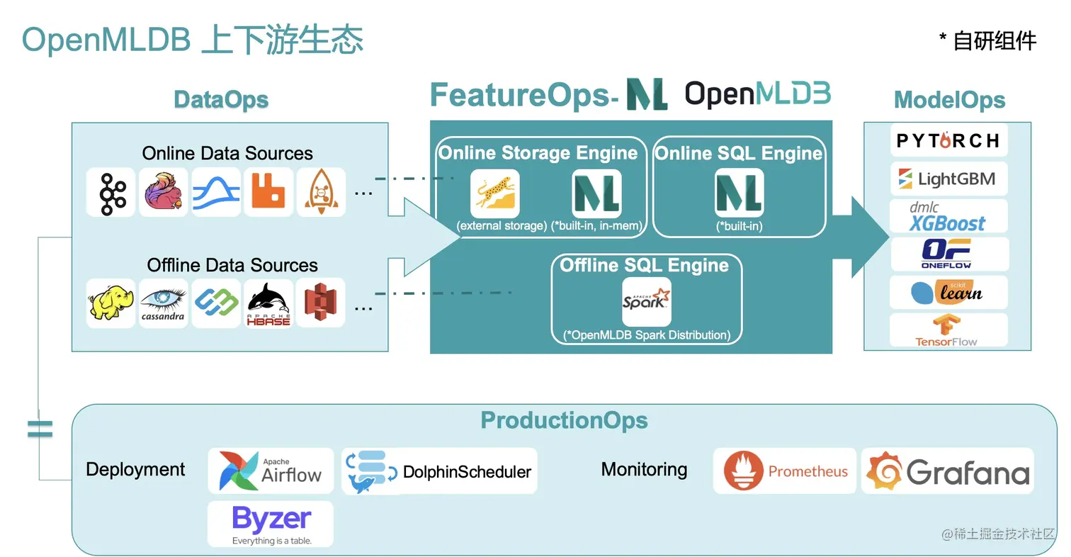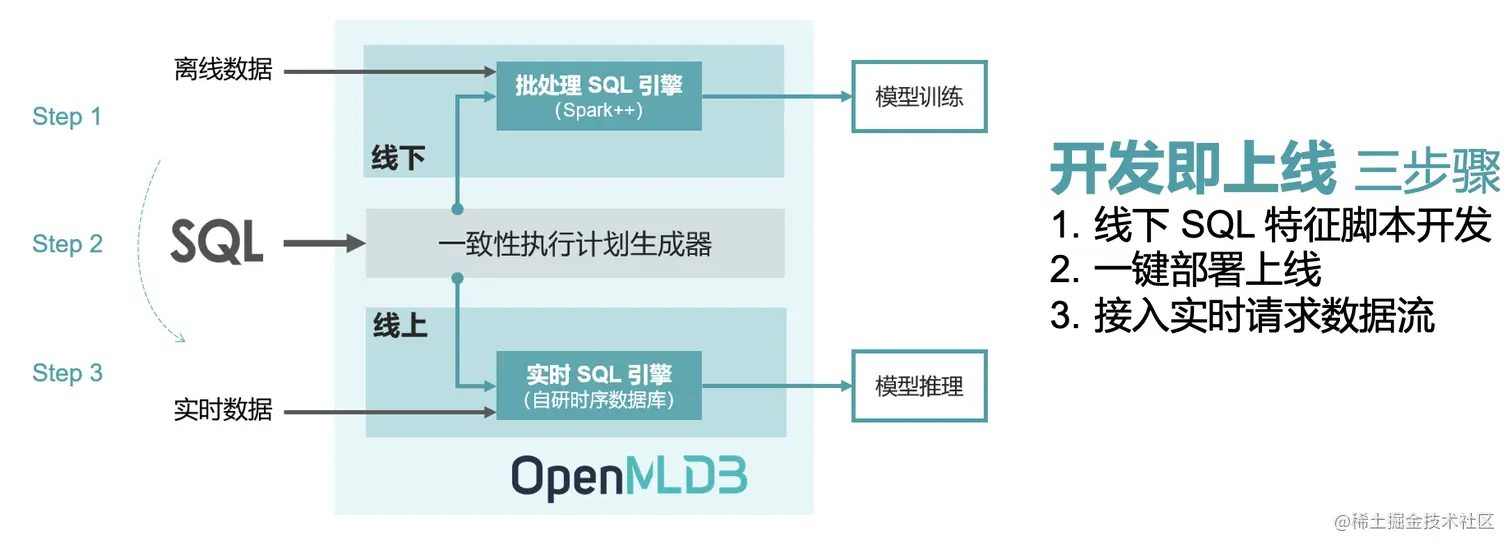 - 基于 SQL 定义特征: 基于 SQL 进行特征定义和管理,并且针对特征计算,对标准 SQL 进行了增强,引入了诸如 LAST JOIN 和 WINDOW UNION 等定制化语法和功能扩充。