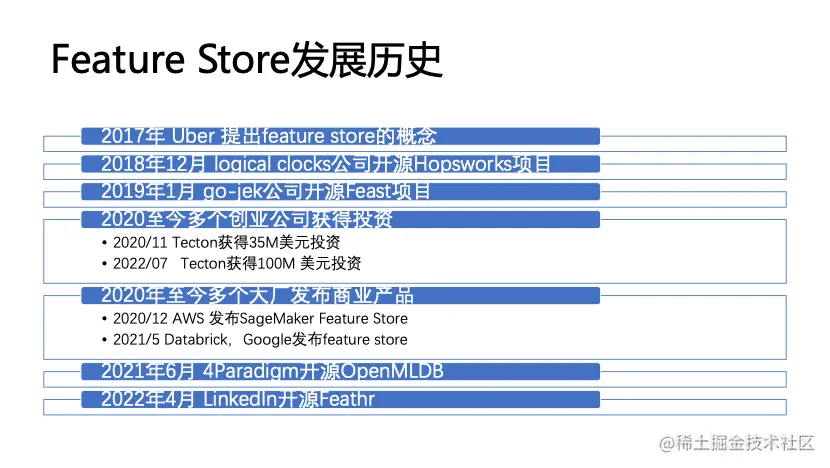 自2017年 Uber 首次提出后,发展至今已有多个创业公司获得投资。2020年至今,国内已有多个大厂发布了相应的商业产品和开源项目。如本次活动中所分享的由第四范式开源的机器学习数据库OpenMLDB、及由领英&微软共同开发维护的企业级高性能开源Feature Store-Feathr等。