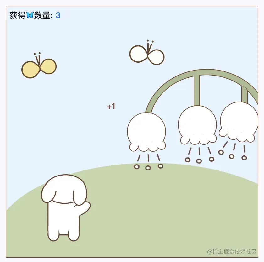 - 当捕获随机数的值是1时,表示捉住了,这个时候除了展示“+1”的字样,左上角蝴蝶数量增加1,且当前蝴蝶小时,2秒之后重新展示(通过定时设置)。