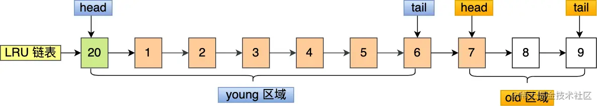 现在有个编号为 20 的页被预读了,这个页只会被插入到 old 区域头部,而 old 区域末尾的页(10号)会被淘汰掉。
