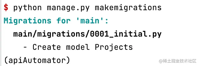 python manage.py makemigrations,可以看到main/migrations/下新增了0001_initial.py,这个就是用来初始化数据库表结构。