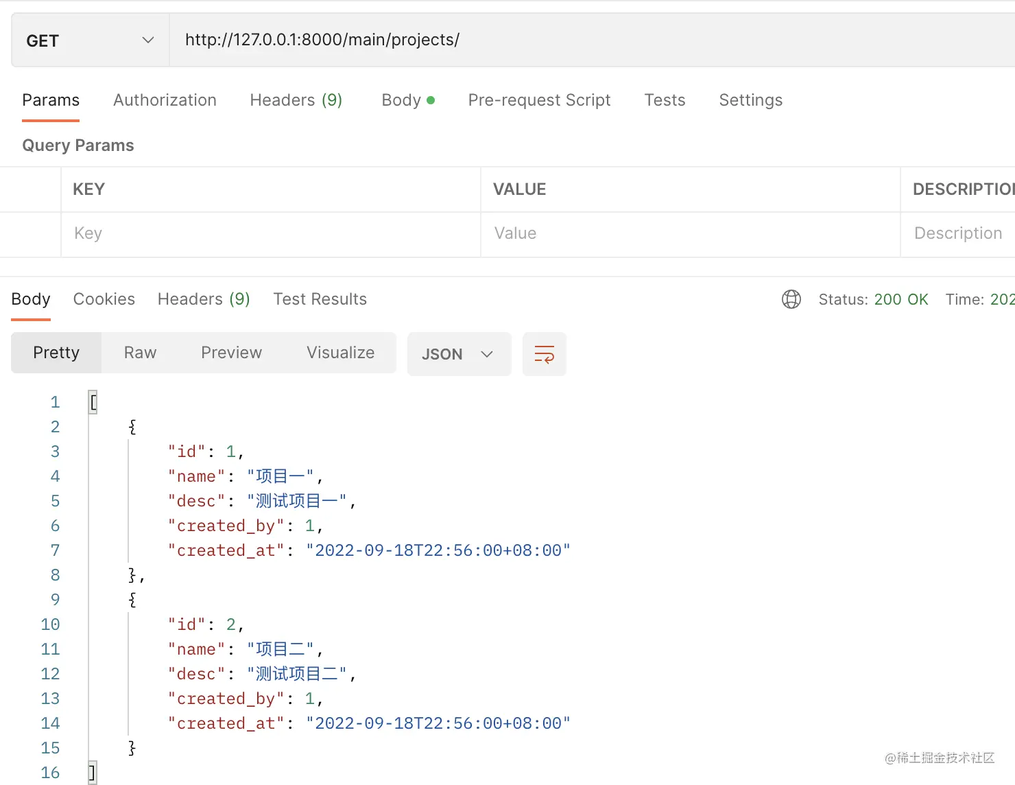 - 使用postman验证接口是否返回正常,以下是在Admin后台手动新增了两条记录,项目列表查询的结果。
