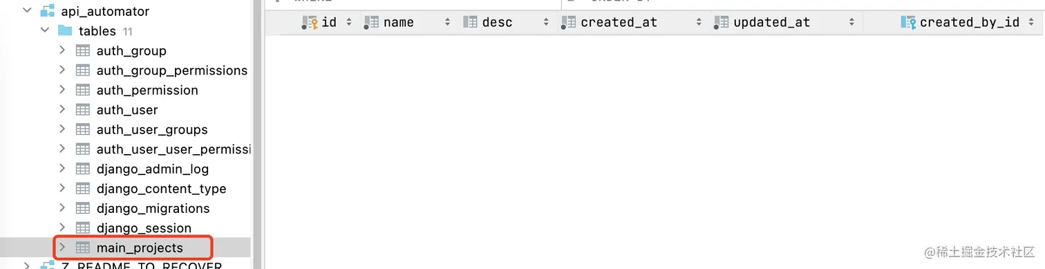 python manage.py migrate执行初始化数据库表结构文件,将改动应用到数据库。执行后可以看到数据库新增了一张表main_projects。