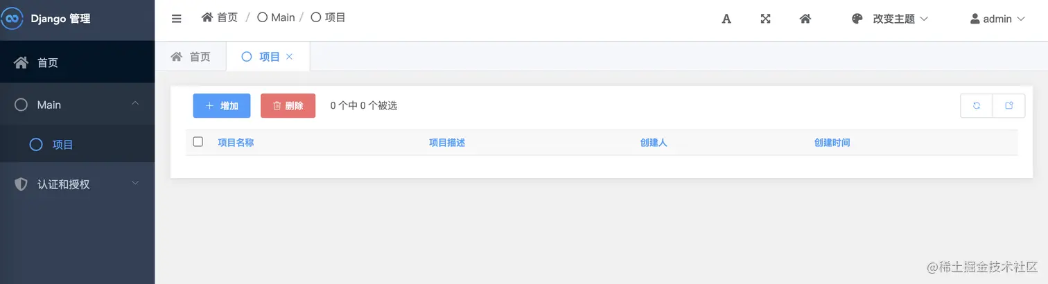 再次启动后端项目,访问admin管理后台,可以看到新增了Main/项目目录,并且列表展示了对应的字段,Admin后台增删改查功能都已经有了。但是是仅针对projects单表的操作,是不完善的,所以需要我们自己去开发更适合平台上使用的能力。但是Admin可以用来进行测试或者操作数据库,所以还是建议将自己创建的model注册到Admin。