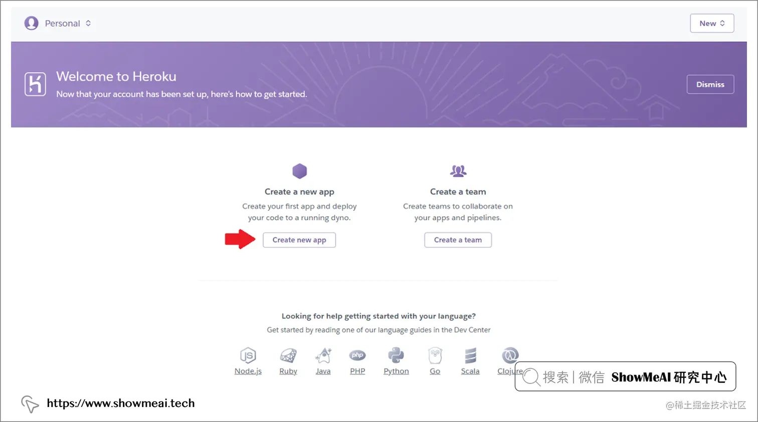 将所有文件上传到 GitHub 后,我们就可以开始在 Heroku 上进行部署了。如下为操作步骤:
