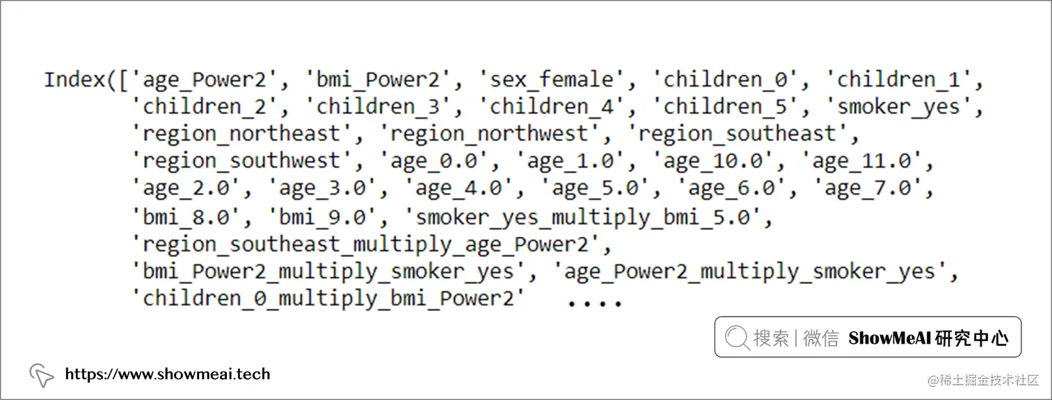 上述的代码会自动化完成数据转换,转换后的数据集有 62 个用于训练的特征,这些特征由原始数据集的 7 个特征变换而来。以下为对应的特征列表: