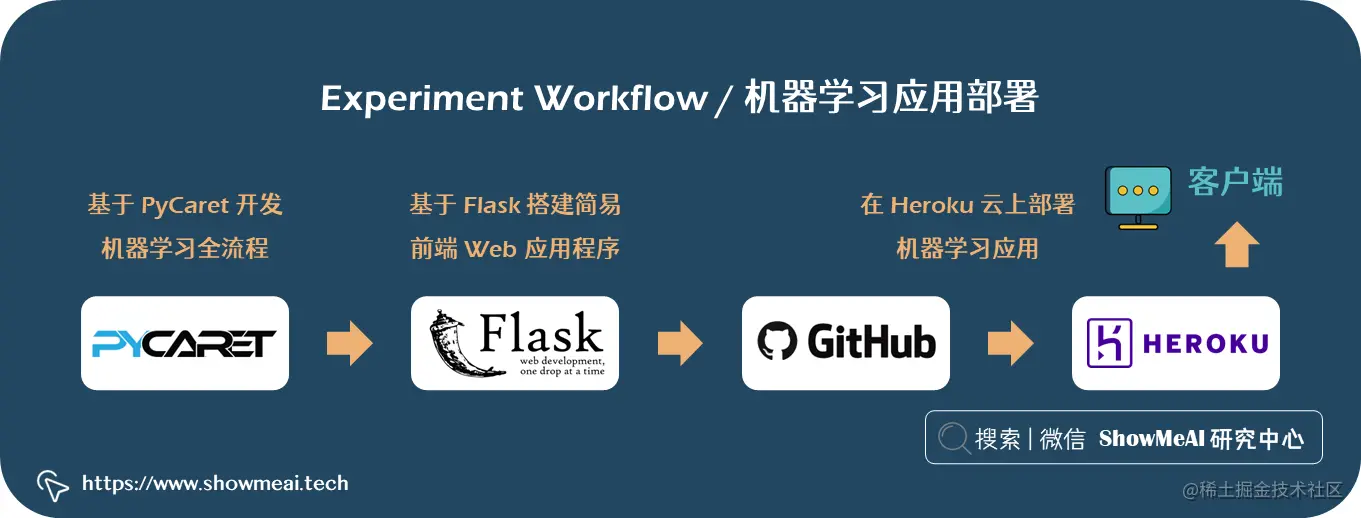 本教程中,我们讲解的是『在线预测』这种模式。我们将首先使用 PyCaret 在 Python 中构建机器学习管道,然后使用 Flask 构建 Web 应用程序,最后将所有这些部署在 Heroku 云上。