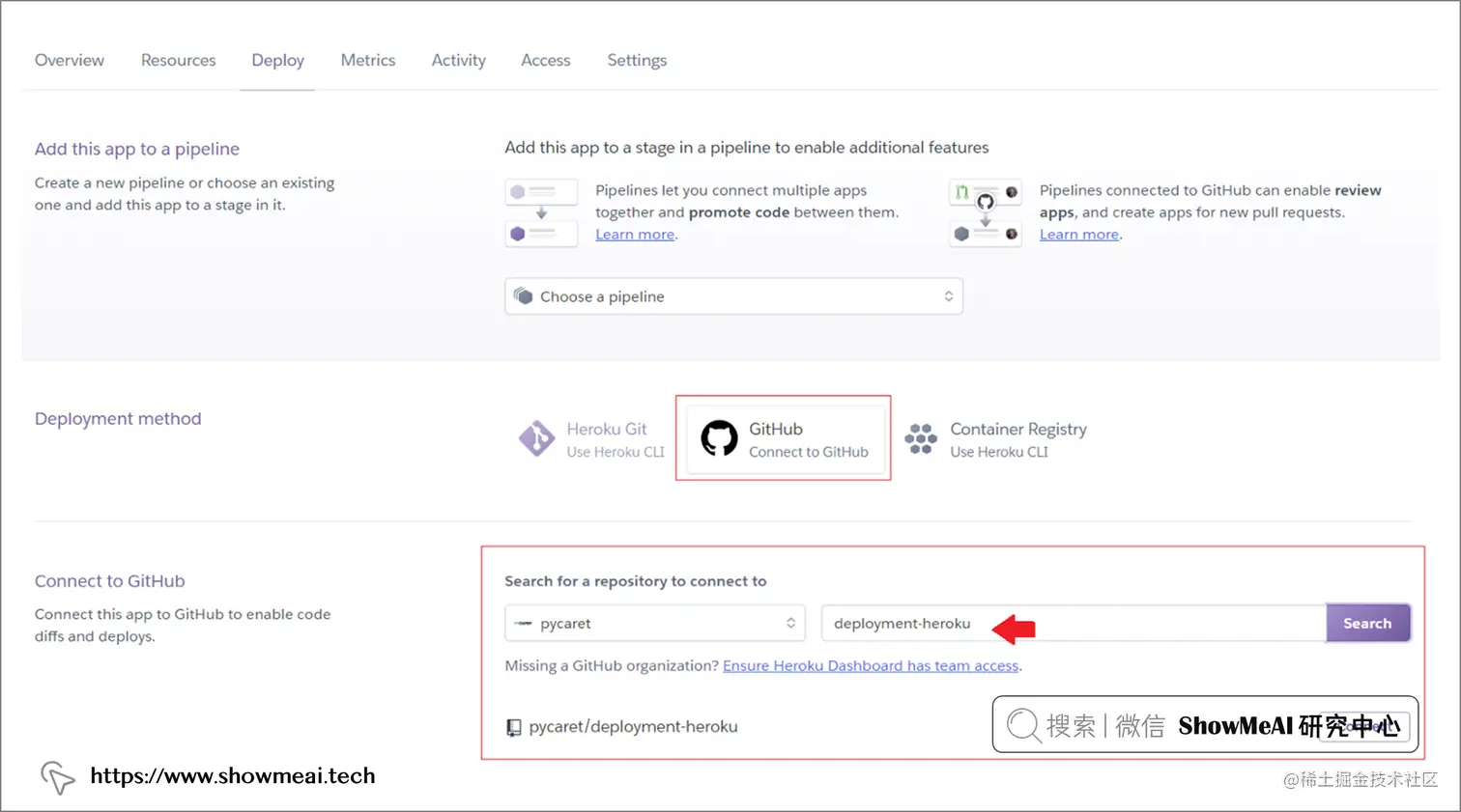 模型训练完成后,机器学习流水线已经准备好,且完成了本地测试,我们现在准备开始部署到 Heroku。有多种方法可以完成这个步骤,最简单的是将代码上传 GitHub ,并连接 Heroku 帐户完成部署。