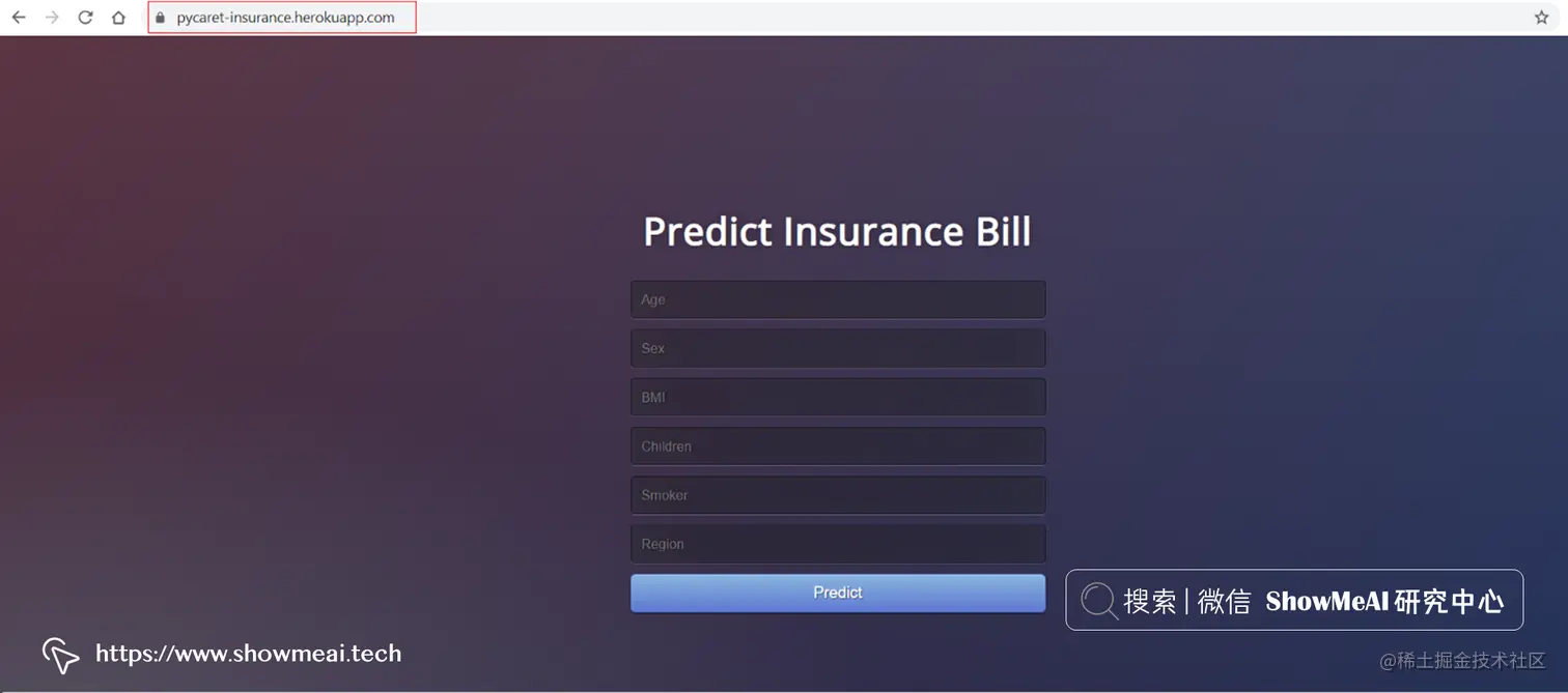 部署完成后,在有网络的情况下,就都可以访问对应的应用程序了 📘https ://pycaret-insurance.herokuapp.com/。