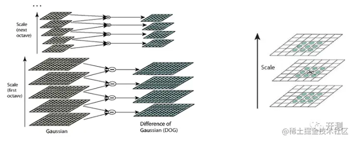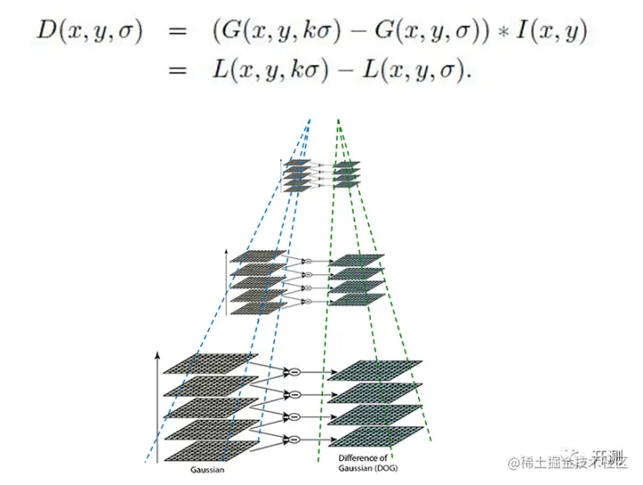 LoG 的计算量非常大,为了有效的在尺度空间检测到稳定的关键点,所以 SIFT 算法使用高斯差分算子(DoG)来对 LoG 做近似。利用不同尺度的高斯差分核与图像卷积生成。具体到图像处理来讲,就是将两幅图像在不同参数下的高斯滤波结果相减,得到DoG图