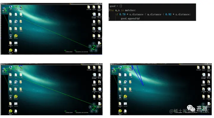 检测出的匹配点可能有一些是错误正例(false positives)。因为这里使用过的kNN匹配的k值为2(在训练集中找两个点),第一个匹配的是最近邻,第二个匹配的是次近邻。直觉上,一个正确的匹配会更接近第一个邻居。换句话说,一个不正确的匹配,两个邻居的距离是相似的。因此,我们可以通过查看二者距离的不同来评判匹配程度的好坏。并且舍去那些不好的匹配点,保留好的匹配点。