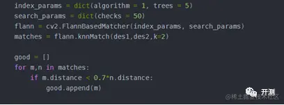 使用 FLANN 匹配,我们需要传入两个字典作为参数。这两个用来确定要使用的算法和其他相关参数等,第一个是 IndexParams,第二个字典是 SearchParams。用它来指定递归遍历的次数。值越高结果越准确,但是消耗的时间也越多。