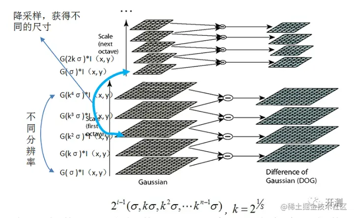 图像金字塔:我们可以通过降采样(如只取奇数行或奇数列)来构成一组图像尺寸(1,0.5,0.25 等)不同的金字塔,然后对这一组图像中的每一张图像使用具有不同方差 σ 的高斯卷积核构建出具有不同分辨率的图像金字塔(不同的尺度空间)。DoG 就是这组具有不同分辨率的图像金字塔中相邻的两层之间的差值。如下图所示: