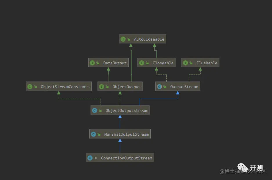 通过查看代码,可知RMI是使用对象流IO类ObjectOutputStream和ObjectInputStream来实现对象的序列化传输,该流可以将一个对象写出,或者读取一个对象到程序中,也就是执行了序列化和反序列化操作,而需要被序列化和反序列化的类必须实现Serializable 接口。
