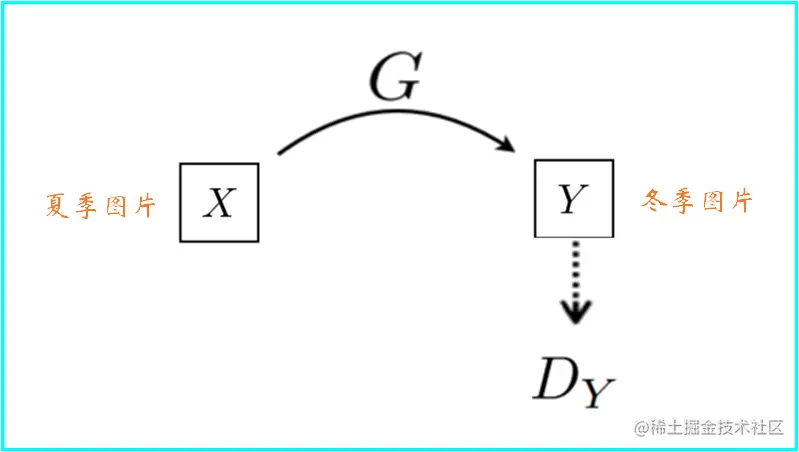 我们先来明确一下这篇文章的目标,即有两个域的图像,分别为域X和域Y,例如域X表示夏季图片、域Y表示冬季图片,现期望将这两个域的图片互相转换,即输入域X的夏季图片生成器输出域Y的冬季图片或输入域Y的冬季图片生成器输出域X的夏季图片。我们来考虑考虑传统的GAN网络能否完成这项任务,示意图如下: