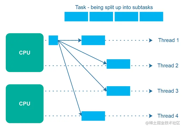 下图说明了一个更大的任务,该任务被分成 4 个子任务。这 4 个子任务由 4 个不同的线程执行,这些线程在 2 个不同的 CPU 上运行。这意味着,这些子任务的一部分是并发执行的(那些在同一个 CPU 上执行的),而部分是并行执行的(那些在不同的 CPU 上执行的)。