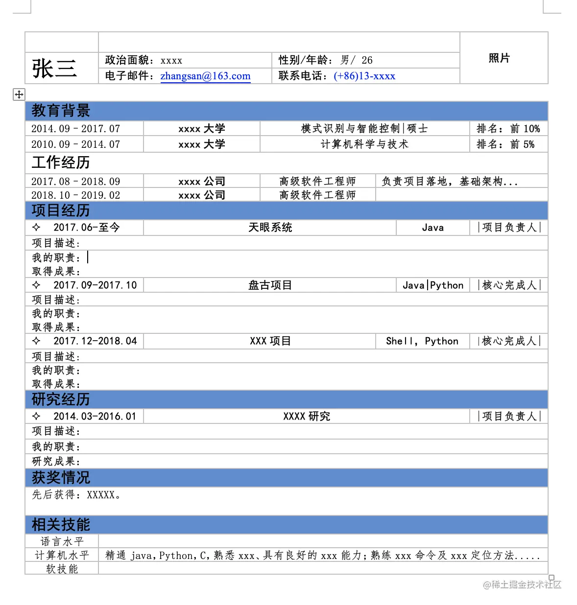 在此,我提供一份同事们比较认可的简历样式模版,当然,这肯定不是最好的,仅作为参考。