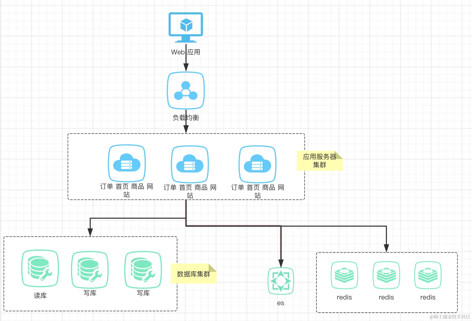 所有的同事开始一起优化项目,商品搜索使用全文检索技术ES完成,并且引入缓存(Redis集群),于是架构变成了这个样子。