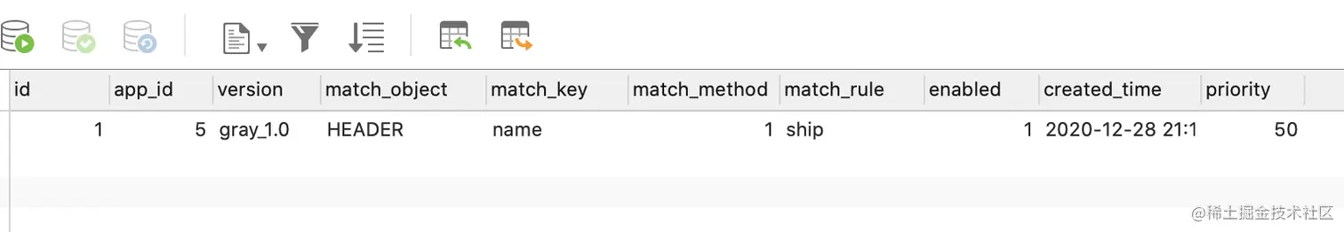 - 在数据库添加路由规则配置,该规则表示当http header 中的name=ship是请求路由到gray_1.0版本的节点。