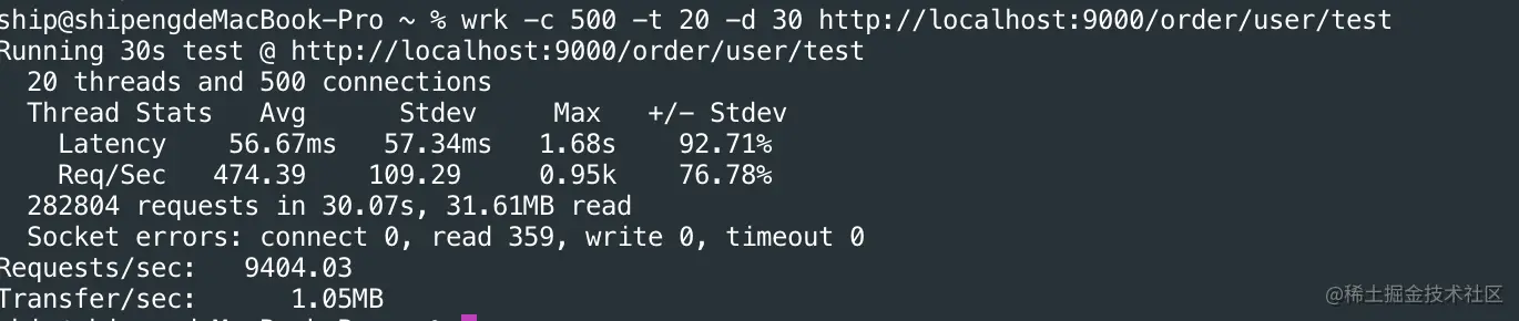压测结果:20个线程,500个连接数,吞吐量大概每秒9400个请求。